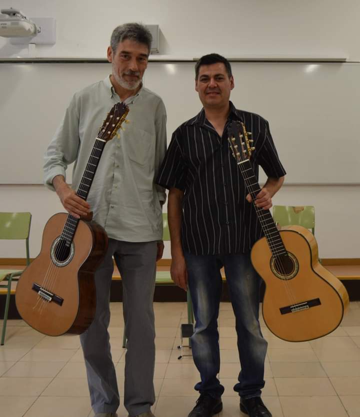 Zusammen mit Juan Carlos López Segura, Konzertspieler und Gitarrenlehrer, beim Tragen eines Nomex-Modells im Fernando Caldera Workshop.